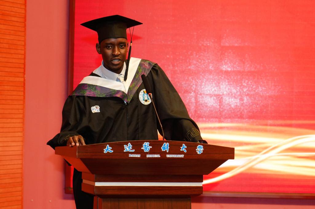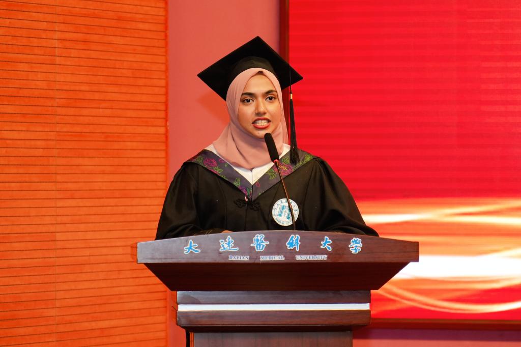 来自乍得的林雅博及来自斯里兰卡的扎拉两位同学作为此届毕业生代表进行发言,他们郑重感谢母校对各位留学生的栽培,并表示今后无论身在何方,都将以大医校友身份继续发光发热,传承大医精神,讲好中国故事,传播中国声音。