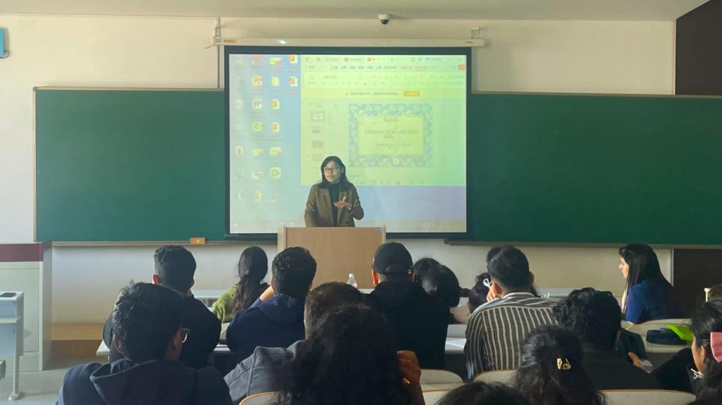 直属党支部副书记郭艳秋代表学院致辞。她鼓励同学们在专注学业的同时,积极参与校园活动,不断挑战自我,实现个人成长的新跨越。郭书记还就校园安全、汉语学习、出勤管理、考试纪律等重点事项进行了强调,为新生们明确了大学学习生活的基本准则和努力方向。随后,招生科、教学管理科以及学生管理科的老师们分别从各自工作领域为新生进行宣讲。招生科老师全面介绍了学院丰富多样的招生项目,让新生们对自己的学业背景和未来发展路径有了更清晰的认识。教学管理科老师重点对学籍管理规定进行了详细说明,帮助新生们更好地规划学习计划,明确学习目标。学生科老师则详细阐释了涵盖文明礼仪、校园秩序、学习纪律等多方面的行为规范,为他们在校园内的学习和生活提供了明确指引。