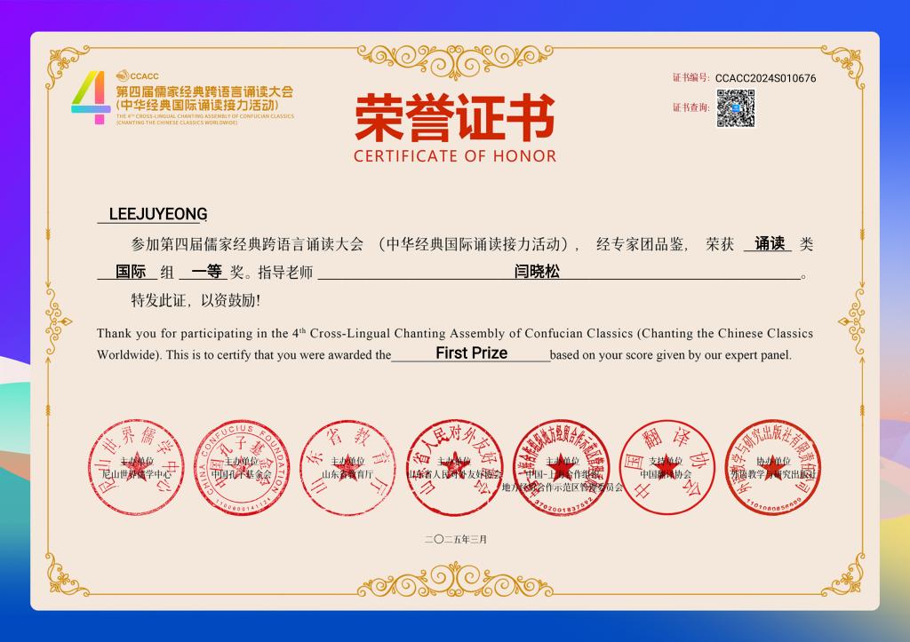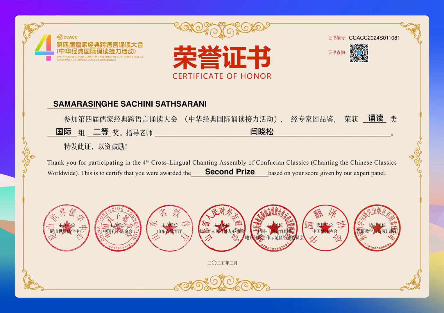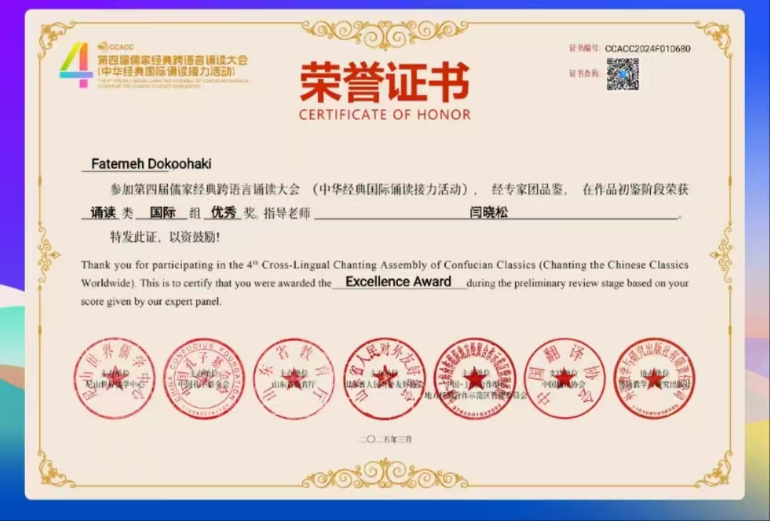 近日,第四届儒家经典跨语言诵读大会圆满落幕。本届大会由尼山世界儒学中心、中国孔子基金会、山东省教育厅等单位联合主办。经过初审、复评、终评三轮严格评审,我校三名留学生取得优异成绩:韩国籍留学生李珠英获得诵读类国际组一等奖,斯里兰卡籍留学生芮妮获得诵读类国际组二等奖,伊朗籍留学生法特萌获得诵读类国际组优秀奖,三人均被授予“儒家经典传习人”称号。