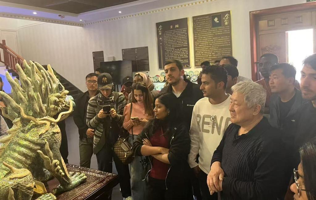 4月23日,近50名来自巴基斯坦、也门、斯里兰卡等多个国家的留学生走进金阿山艺术馆,近距离感受中国传统贝雕艺术的独特魅力。