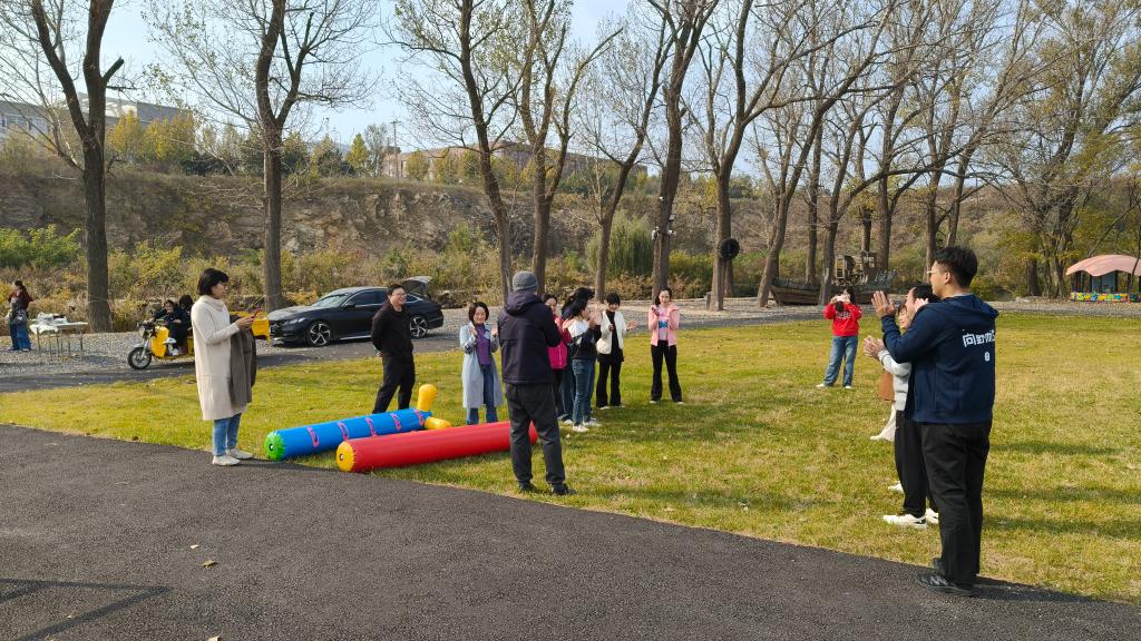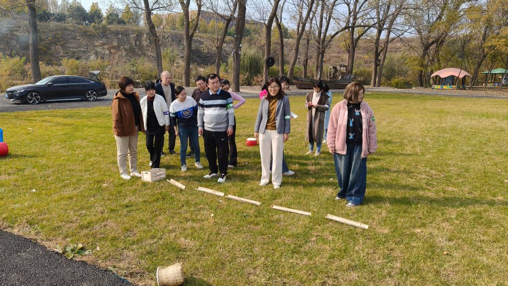 活动当天,秋高气爽,阳光和煦。抵达庄园后,学院工会在开阔的草坪上组织了形式多样的集体互动项目。教职工们分为蓝、绿两队,先后参与了跳绳、投壶、“你说我找”等趣味竞技游戏。现场气氛热烈,欢声笑语不断。在轻松愉快的竞赛氛围中,老师们不仅锻炼了身体,更在协作配合中深化了彼此的了解与信任。活动特别设置了趣味惩罚环节,招生办公室金钊老师一曲高歌,教学管理科王一儒老师精彩纷呈的扑克魔术表演,赢得了在场教职工的阵阵掌声,充分展现了学院教师多才多艺、朝气蓬勃的精神风貌。